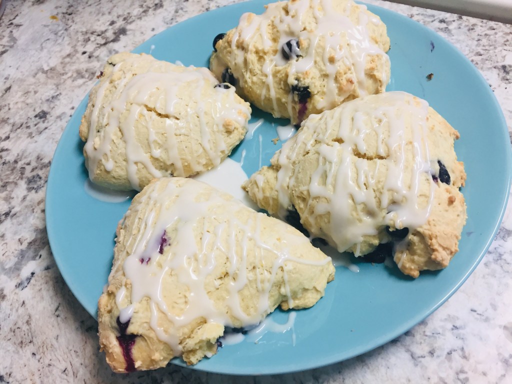 Preheat oven to 425 and grease one large baking sheet. Place cold butter and cream cheese in a mixing bowl, add all dry ingredients and cut together with pastry cutter (or large fork) until mixture resembles coarse sand. Next add all wet ingredients except milk. Mix until a dough just comes together add small amounts milk as needed if mixture is too dry. Once a dough forms, roll into a ball and turn out onto a floured surface and flatten until about an inch thick. Cut into 8ths or 10ths depending on how big you want your scones to be. Place on baking sheet and put them in the oven for about 2 mins at 425 then reduce heat to 375 and bake for an additional 13-15 minutes, or until puffed and slightly golden at the edges. Let cool throughly on baking sheet. While that happens, mix up your drizzle. Place all ingredients in a small mixing bowl and whisk with a fork. Add more milk or powdered sugar if necessary to get a nice drizzling consistency. Once scones are cool, drizzle until you can’t drizzle anymore (because you’re out of icing). You can enjoy these right away or wait (who does that) for the icing to harden which takes like 20-30 minutes. After that there is nothing left to do but eat!
